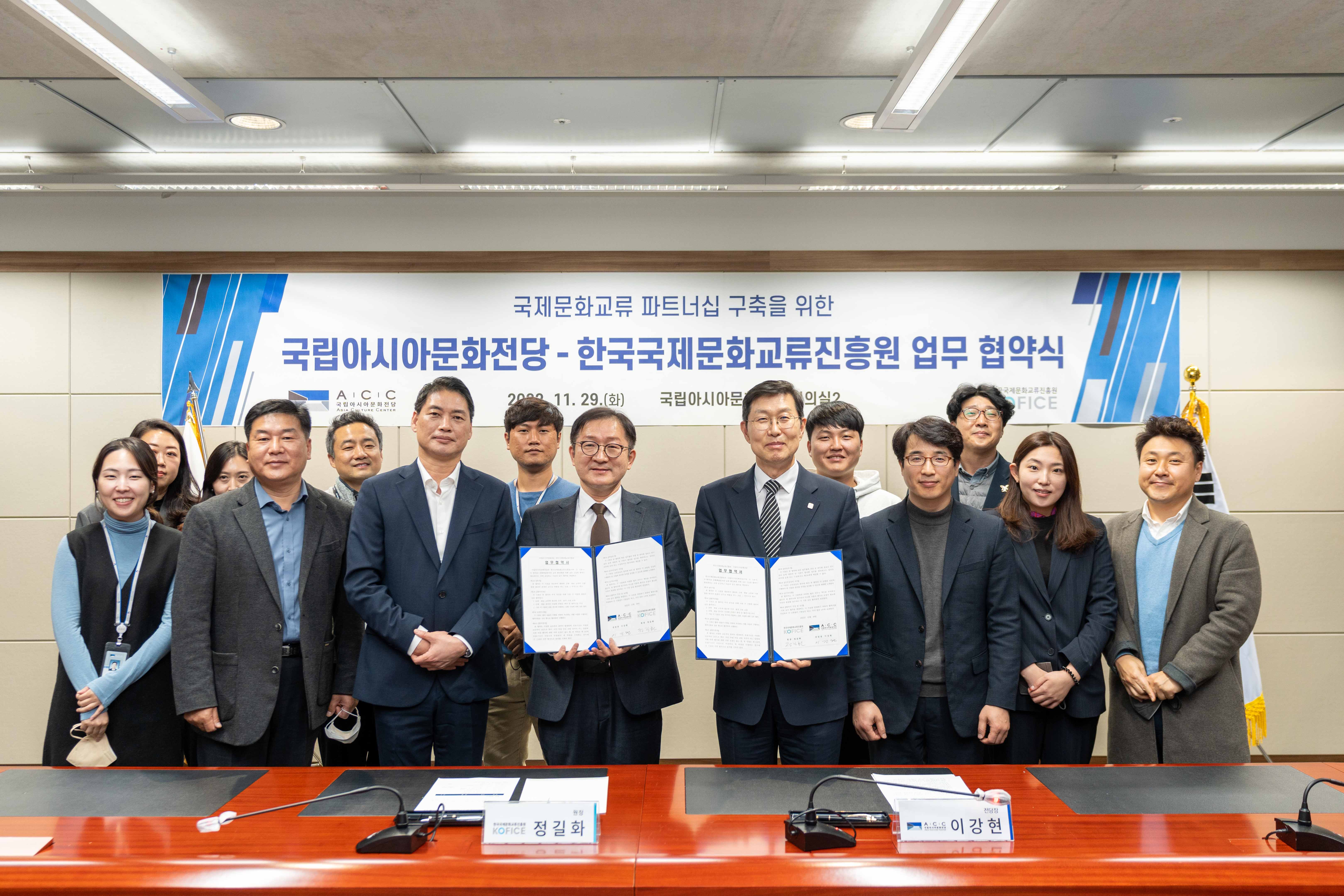국립아시아문화전당이 국제 문화교류 활성화를 위해 국제교류 관계 기관과 동반자 관계 구축에 나섰다. 문화체육관광부 국립아시아문화전당(ACC, 전당장 이강현)과 한국국제문화교류진흥원(KOFICE, 원장 정길화)은 29일 두 기관이 국제 문화예술 교류의 교두보 역할을 해 나가자는데 인식을 같이하고 ACC 회의실에서 동반 관계 구축을 위한 업무협약을 체결했다.