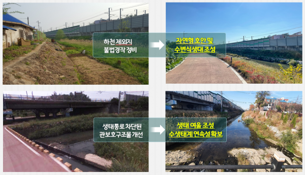 오산시는 훼손된 하수관로 정비, 도심지 비점오염원 유입 저감을 위한 시설 설치 등으로 수질을 개선했고 생태여울, 하중도 및 수변식생대를 조성해 생물서식공간도 확보했다.