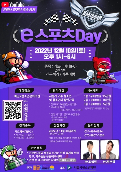 ‘2022년 e스포츠데이’는 카트라이더 대회로 진행되며 시흥시에 거주하는 만 9세~24세 청소년은 또래 친구 또는 가족과 2인 1팀이 되어 ‘친구끼리 가족이랑’ 부분에 참여할 수 있다.