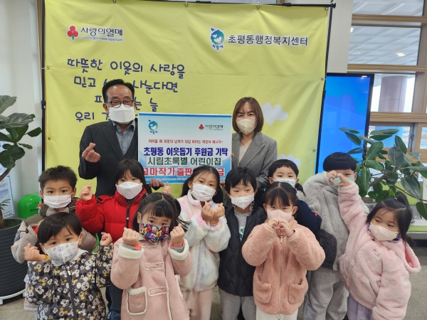 심연섭 초평동장은 “경기침체로 어려운 시기에 따뜻한 나눔을 실천해 주신 시립초록별어린이집 홍진희 원장님과 관계자 분들께 감사의 말씀을 드리며 아이들의 소중한 마음이 담긴 후원금은 관내 복지사각지대 해소를 위한 복지사업에 사용하겠다”고 말했다.