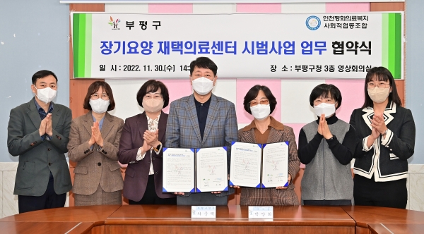 [금요저널] 부평구는 지난 30일 구청 영상회의실에서 인천평화의료복지 사회적협동조합과 ‘장기요양 재택의료센터 시범사업’ 추진을 위한 업무협약을 체결했다.
