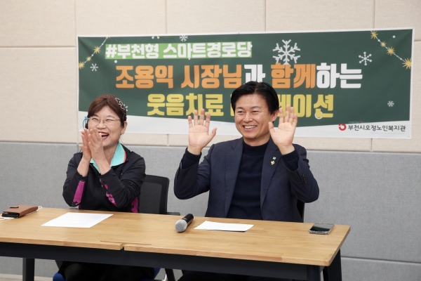 [금요저널] 부천시는 지난 1일 오정노인복지관 스튜디오에서 ICT 화상플랫폼을 이용해 조용익 부천시장과 함께 스마트경로당 프로그램인 웃음치료를 진행했다.