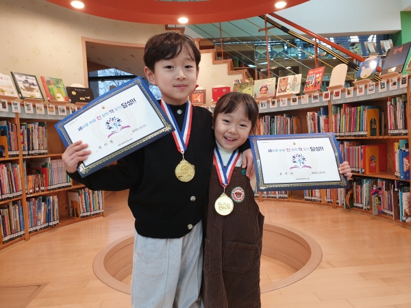 윤이나, 윤이원 어린이는 12월 1일 어린이도서관에 방문해 세천책 달성 인증서와 메달을 받았다.