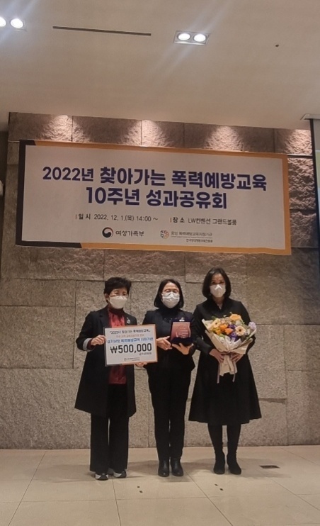 특히 올해에는 사회적 이슈로 떠오른 디지털 성범죄와 데이트폭력에 대한 예방교육을 중점적으로 실시해 지역사회 가정폭력, 성폭력, 성매매 등 예방 및 인식개선에 기여해 왔다는 평가를 받았다.