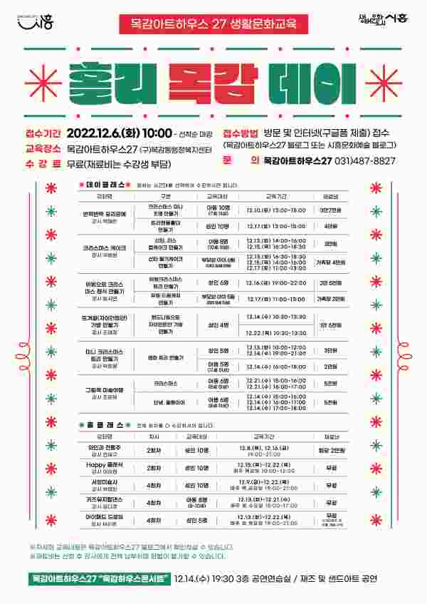 [금요저널] 시흥시는 목감아트하우스27에서 진행하는 2022년 마지막 생활문화교육 ‘홀리목감데이’ 참여자를 오는 12월 6일 오전 10시부터 선착순으로 모집해 시민들의 일상에 쉼을 선사한다.