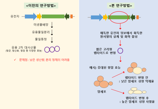 기존에는 주로 미생물을 생균 형태로 활용하거나 유용 대사산물을 정제해 활용했으나, 이는 배양이 어렵거나 펩타이드의 생산 효율이 낮은 경우가 많아 생물자원의 실용화에 한계가 있었다.
