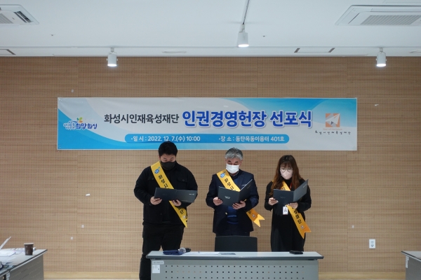 [금요저널] 재단법인 화성시인재육성재단이 지난 7일 동탄목동이음터에서 대표이사와 각 부서장 및 팀장 등 22명이 참석한 가운데 ‘화성시인재육성재단 인권경영헌장 선포식’을 개최했다.