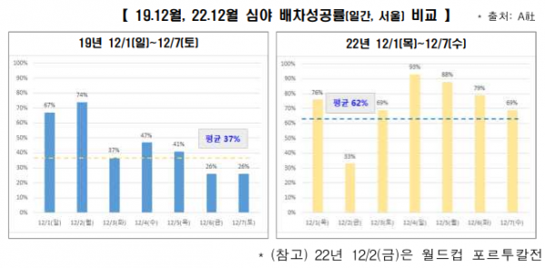 에도 10월의 27%보다 9%p 상승했으며 12월 1일부터 7일까지 심야시간 평균 배차성공률은 62%로11월보다 대폭 상승하는 추세이다.