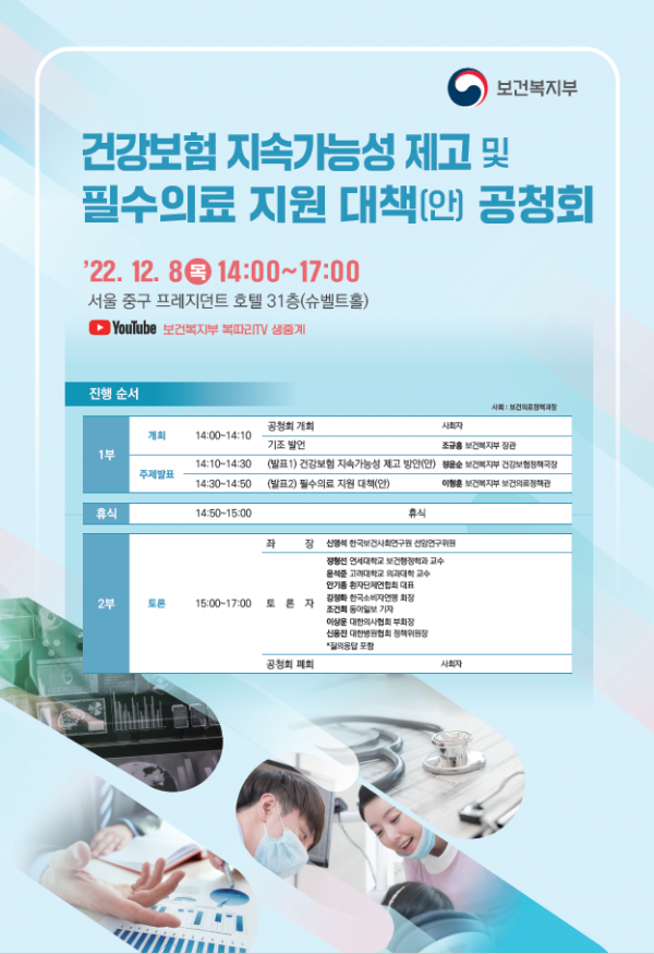 [금요저널] 보건복지부는 12월 8일 오후 2시 프레지던트호텔에서‘건강보험 지속가능성 제고 및 필수의료 지원 대책’에 대한 공청회를 개최했다.