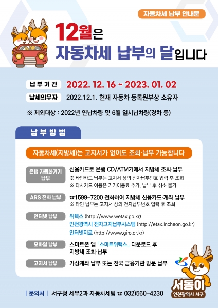 [금요저널] 인천 서구는 올해 제2기분 자동차세 14만 건에 대해 186억원을 부과하고 내년 1월 2일까지 납부를 당부했다.