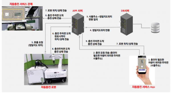 자율주행로봇 충전 서비스는 운전자가 실내 주차장에 주차 후 ‘자율주행충전앱’에 주차 칸 주소를 입력하면 충전용 자율주행로봇이 해당 주차칸으로 이동해 충전하고 그 결과를 ‘자율주행충전앱’을 통해 알려 준다.