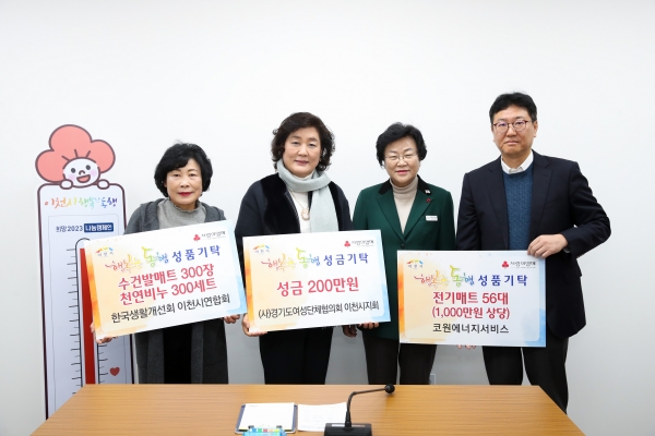 또한 도시가스 공급업체인 코원에너지서비스에서 난방취약계층을 위한 전기매트 56대, 한국생활개선회 이천시연합회에서 생활개선회원들이 직접 제작한 수건발매트 300장·천연비누 300세트를 기탁하며 동절기 어려운 이웃들을 위한 물품 나눔에 적극 동참했다.