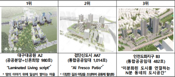 특히 단위세대 평면은 테라스형, 복층형, 재택근무형 등 통합공공임대주택의 다양한 입주계층의 특성이 반영됐고 공원·하천변과 연계하는 가로 설계를 통해 지역주민에게 열린 단지로 계획했다 최우수 작품으로 선정된“대구대공원 A2 블록”은 남고북저의30m 높이의 지형을 극복하고자 대규모 단지를 다양한 가로로 연계하고 중심부를 자연녹지와 공원으로 연결해 하나의 마을로 통일성을 부여했으며 개인정원형, 재택근무형 등 다양한 단위세대 평면 적용과 가로변에 주민공동시설을 복합해 공동체 활성화를 극대화 했다는 점이 우수하다는 전문 심사단의 평가를 받았다.