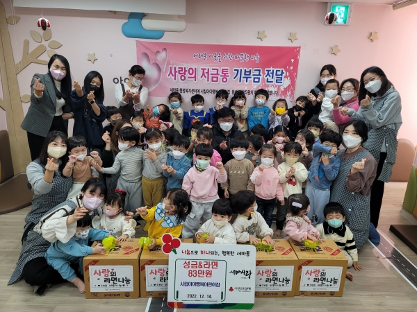 세교행복주택에 위치한 시립아이행복어린이집은 작년에 이어 올해도 나눔을 실천하고 있으며 어린이집에 비치된 돼지저금통에 원아들과 선생님들이 십시일반으로 소중한 후원금을 마련했다.