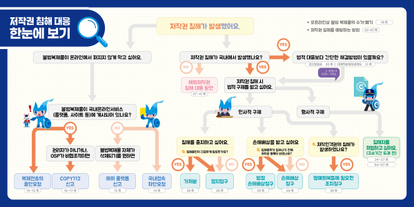 안내서는 불법복제물이 퍼지지 않게 막는 방법, 저작권 침해에 대한 법적 구제를 받는 방법, 해외에서의 저작권 침해에 대응하는 방법으로 구성되어 있으며 붙임으로 저작권 침해 예방 방법도 소개하고 있다.