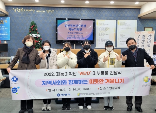 [금요저널] 안양시청소년재단 산하 만안청소년수련관 소속 자치조직 ‘재능기획단 WE:D’는 지난 14일 아동양육시설 안양의집에 100만원 상당의 기부물품을 전달했다.