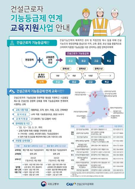 건설근로자 기능등급제는 건설근로자들의 체계적인 경력 관리를 위해 근무 년수·자격·교육·포상이력 등을 기준으로 초·중·고·특급의 4단계 등급을 부여하는 제도이며 건설근로자 기능등급제 연계교육은 각 등급에 맞는 전문성 향상을 지원하기 위해 금년부터 실시하는 사업이다.