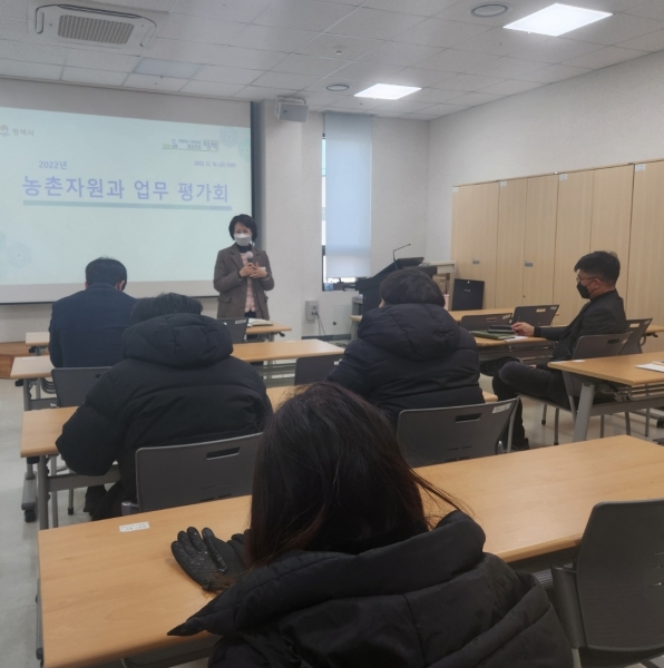 [금요저널] 평택시농업기술센터 농촌자원과는 22명의 부서 직원들이 모인 가운데 지난 16일 농촌문화체험관에서 2022년 업무 추진 평가회를 실시했다.