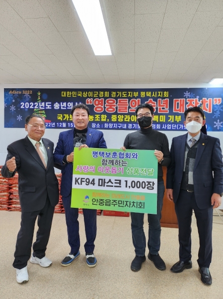 [금요저널] 평택시 안중읍 주민자치회는 지난 15일 지역사회에 기여하는 활동의 일환으로 평택시 보훈협의회를 통해 평택시 상이군경회에 KF-94 방역 마스크 1,000장을 기부했다고 밝혔다.