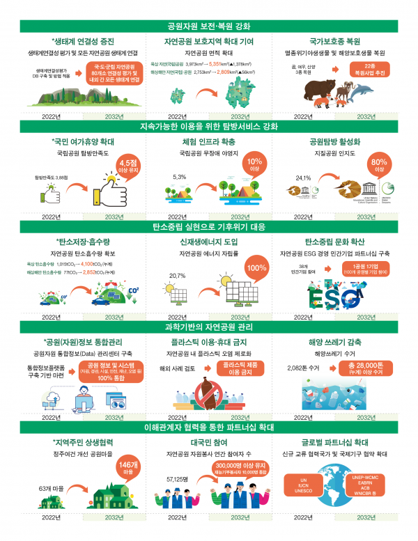 이를 위해 공원 자연 보전·복원 강화, 지속가능한 이용을 위한 탐방서비스 강화, 탄소중립 실현으로 기후위기 대응, 과학기반의 자연공원 관리, 이해관계자 협력을 통한 동반자관계 확대 등 5대 추진전략과 17개 중점추진과제로 구성해 정책방향을 제시했다.