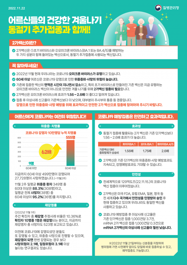 지영미 질병관리청장은, “최근 코로나19로 인한 위중증 환자가 증가하고 있다”고 밝히며 “2가백신은 접종효과가 충분하고 이상반응은 낮은 만큼, 60세 이상과 감염취약시설에 계신 분들은 반드시 접종에 참여해주실 것”을 거듭 당부했다.