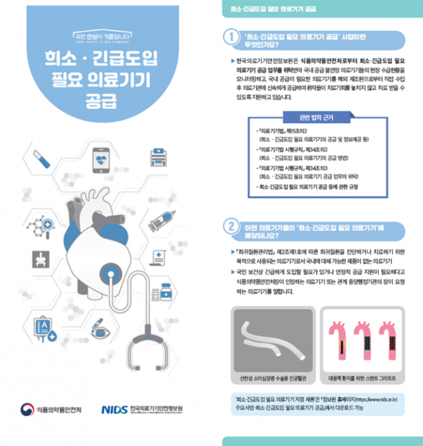 식약처는 희귀·난치질환자에게 필요한 의료기기가 적시에 공급돼 환자의 치료 기회를 확보할 수 있도록 희소·긴급도입 필요 의료기기 지정을 지속적으로 확대하고 있다.