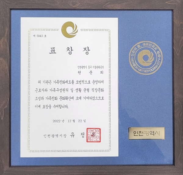 인천광역시는 가족친화인증기업 중 심사를 거쳐 가족친화제도를 모범적으로 운영하고 가족친화인증 문화 확산에 기여한 2개의 공공기관을 선정해 표창했다.