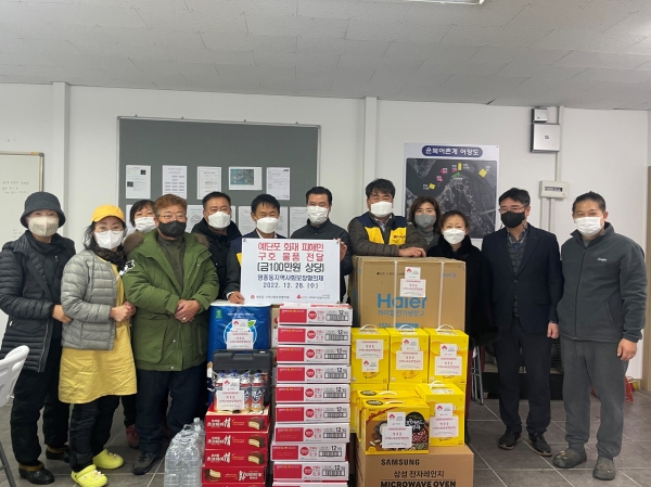 [금요저널] 인천 중구 영종동 지역사회보장협의체는 지난 28일 예단포 화재 피해민 현장에 방문해 구호 물품을 전달하고 빠른 피해 복구를 기원하는 마음을 전했다.