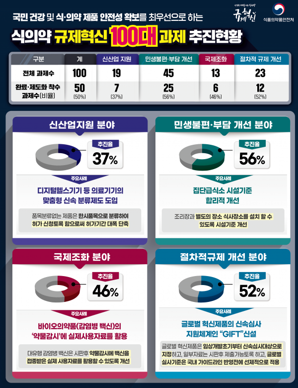 식약처는 식의약 분야 혁신 제품의 신속한 시장 진입과 국내 식의약 산업의 글로벌 경쟁력을 강화를 지원하는 동시에, 국민 안전·건강을 최우선으로 두고 시대·환경 변화에 맞지 않는 규제를 폐지·완화하기 위해 신산업 지원 민생불편·부담 개선 국제조화 절차적 규제 해소 4개 분야의 100개 과제를 발굴해 추진 중에 있다.