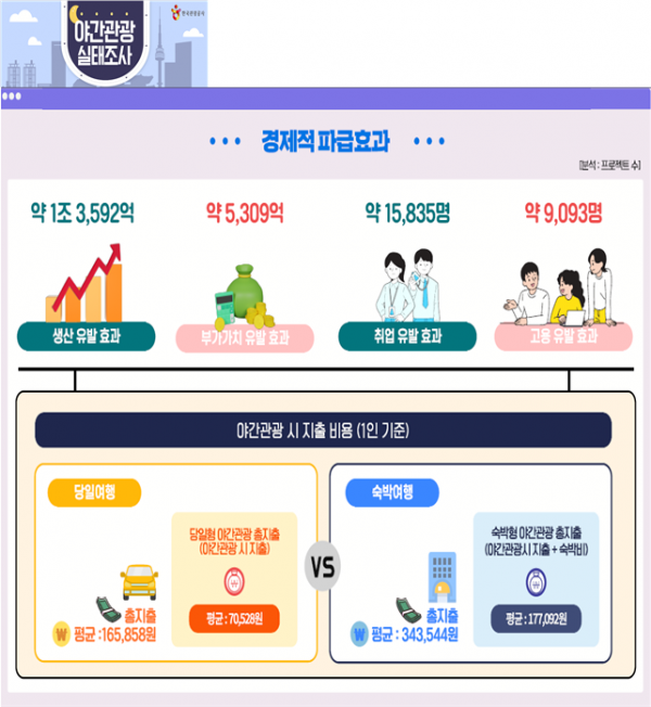 한편 관광공사에서 실시한 ‘2022년 야간관광 실태조사’에 따르면, 야간관광은 연간 약 1조 3,592억원의 생산유발효과는 물론 약 5,309억원의 부가가치유발효과, 약 15,835명의 취업유발효과, 약 9,093명의 고용 유발효과 등 경제적 파급효과로 지역경제 활성화 가능성을 입증했다.