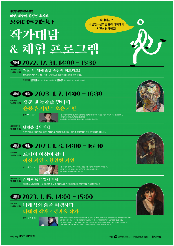 1월 7일에는 오은 시인이 윤동주와 그의 작품을 자신만의 시선으로 이야기하고 1월 8일에는 황인찬 시인이 이상을 주제로 관람객과 소통할 예정이다.