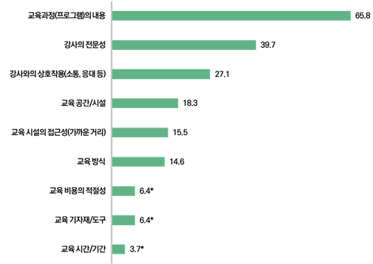 국민이 문화예술교육에 참여하지 않은 이유는 ‘시간이 없어서’, ‘참여하고 싶은 교육 프로그램이 없어서’, ‘교육 프로그램에 대한 정보가 부족해서’, ‘가까운 거리에 교육시설이 없어서’ 순서로 나타났다.