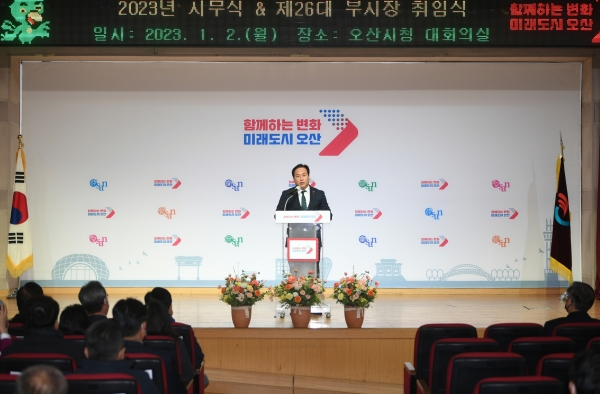 [금요저널] 오산시는 2일 시청 대회의실에서 2023년 계묘년 출발을 알리는 시무식을 갖고 불안한 경제 상황과 녹록치 않은 재정여건 등의 위기를 넘어 재도약하는 스마트 경제도시 오산을 향한 힘찬 발걸음을 내디뎠다.