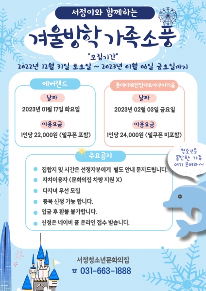 이번 겨울방학 특별프로그램은 청소년들과 가족들이 함께 즐거운 시간을 보내며 계묘년 새해의 첫 다짐과 가족간의 화합을 다지는 보람찬 추억을 만들 수 있도록 오는 17일 에버랜드와 2월 3일 롯데타워 & 아쿠아리움 소풍 프로그램을 준비했으며 ‘2023 서정이와 함께하는 겨울방학 가족 소풍’ 참여 희망자는 서정청소년문화의집 네이버밴드에 게시한 링크를 통해 신청이 가능하다.