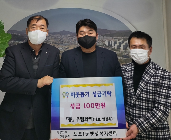또한, 같은 날 우림화학 임택현 대표도 오포1동 행정복지센터를 찾아 어려운 이웃을 위해 써달라며 현금 100만원을 기탁했다.