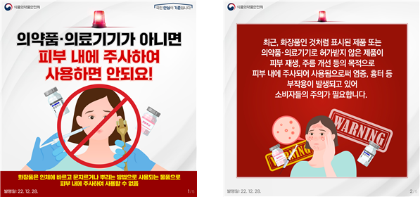 의약품·의료기기가 아닌 제품을 피부 내에 주입하는 방식으로 사용하는 경우 피부 염증·흉터·감염 등 다양한 부작용·후유증이 발생할 위험이 있다.