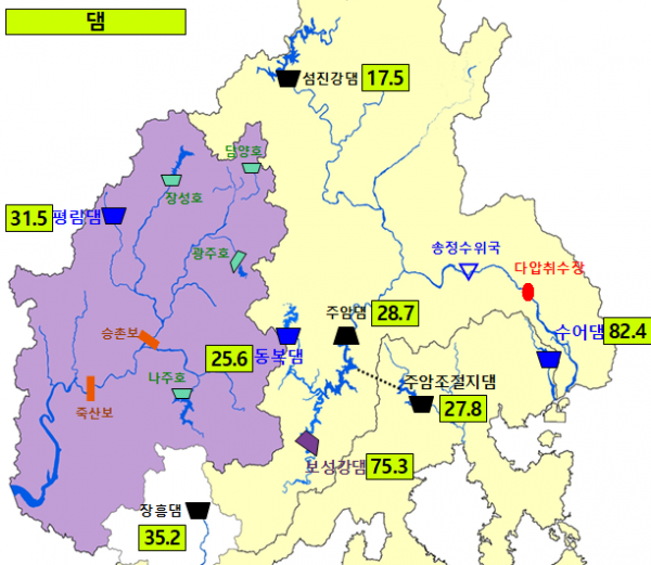 수어댐을 제외한 주암댐, 섬진강댐, 평림댐, 동복댐 등 이 지역 유역의 댐 저수율은 18~32%를 기록하고 있다.