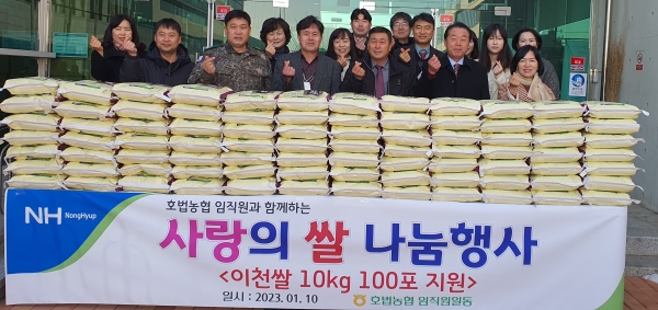 [금요저널] 이천시 호법농협은 1월 10일 2023년 새해를 맞이해 임직원들이 모은 성금으로 이천쌀 10KG 100포를 관내 저소득 취약계층에게 전달해 달라며 호법면 행정복지센터에 기탁했다.