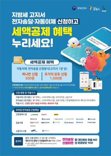 박승원 광명시장은 “편리하고 안전하며 지속가능한 탄소중립 실현과 더불어 세제 공제 혜택도 함께 누릴 수 있는 지방세 전자 송달을 많이 신청해 주시길 바란다”고 당부했다.