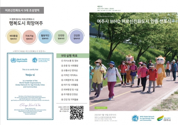 현재 51개국, 1445개 도시가 가입해 상호교류 중에 있으며 여주시도 지난해 12월에 어르신친화도시로 가입·인증되어 금번 선포식을 통해 어르신 정책기반을 조성하고자 한다.