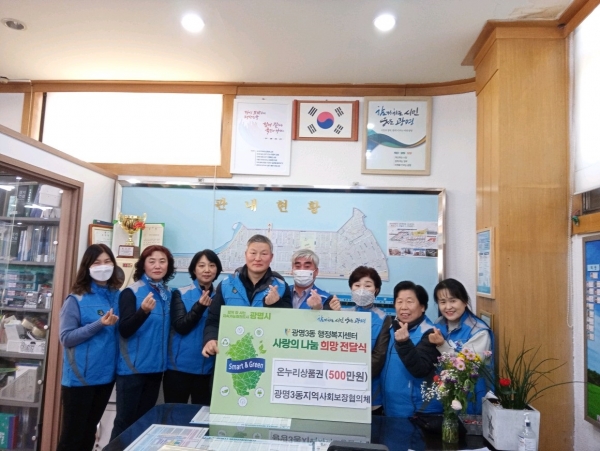 김군채 광명3동 지역사회보장협의체 위원장은 “온누리상품권 지원으로 행복한 설 명절 준비를 하셨으면 하는 바람이다”며 “새해에도 위원들과 더욱 힘을 모아 우리 지역 내 도움이 필요한 이웃을 위해 나눔과 봉사에 앞장서는 지역사회보장협의체가 되겠다”고 말했다.