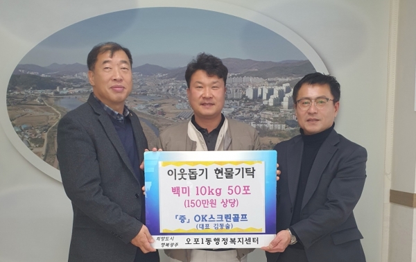 또한, 같은 날 오포1동에 사업장을 두고 있는 OK스크린골프 김동술 대표도 백미 50포를 전달했다.