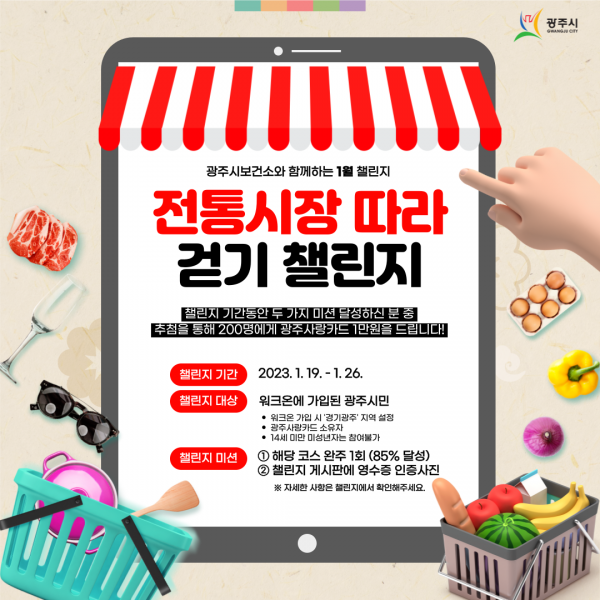 워크온 내에 등록된 전통시장 따라 걷기 코스를 걷고 광주시 전통시장이나 걷기 코스 내 위치한 상점에서 구매한 영수증을 인증하면 추첨을 통해 200명에게 지역화폐 1만원권을 증정한다.