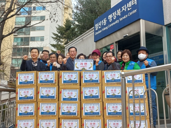 [금요저널] 광명시 철산1동 지역사회보장협의체에 광명새마을금고에서 ‘사랑의 좀도리 운동’ 나눔 행사로 지난 17일 라면 50박스를 전달했다.