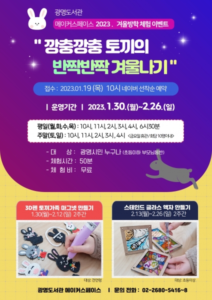 광명도서관 메이커스페이스는 시민들이 2023년 계묘년을 맞아 ‘깡충깡충’ 토끼처럼 힘차게 시작하고 ‘반짝반짝’ 빛나는 한 해가 되기를 기원하는 마음으로 온 가족이 함께할 수 있는 다양한 체험을 오는 1월 30일부터 2월 26일까지 운영한다.