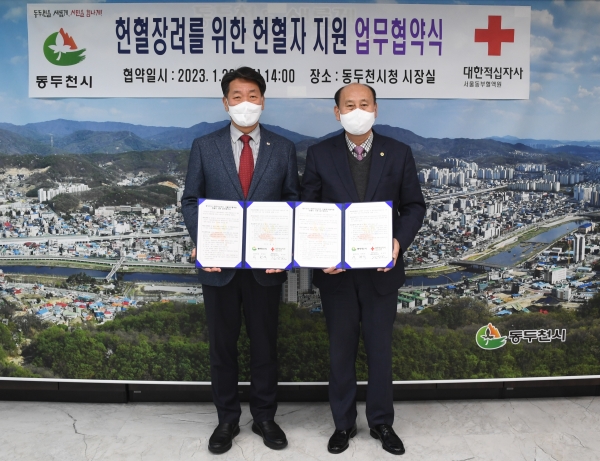 [금요저널] 동두천시와 대한적십자사 서울동부혈액원은 지난 20일 시청 시장실에서 헌혈장려를 위한 헌혈자 지원 업무 협약을 체결했다.