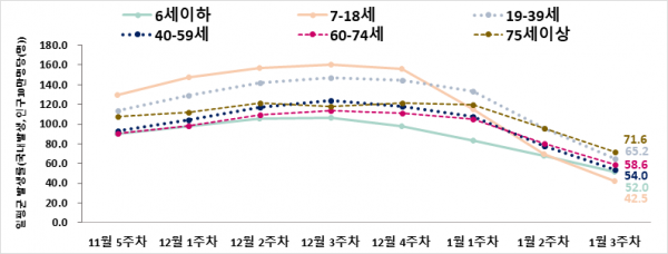 최근 8주간(’22.11.27.~1.21.) 연령군별 주간 일평균 발생률(인구10만명당) 추이