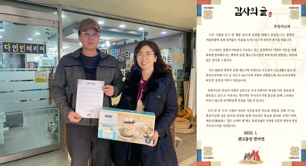 [금요저널] 이천시 관고동행정복지센터는 명절을 앞두고 지난 1월 17일부터 1월 19일까지 3일간 관고동 관내 재능기부활동에 참여중인 행복한 동행 사업장 23개소를 직접 찾아가 감사서한문과 함께 작은 선물을 전달하며 새해에도 지속적인 참여를 독려했다.