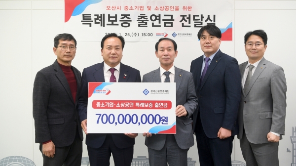 시에 따르면 25일 시장 집무실에서 이권재 오산시장, 정민화 경기신용보증재단 상임이사가 참석한 가운데 특례보증 출연금 7억원 전달식을 가졌다.