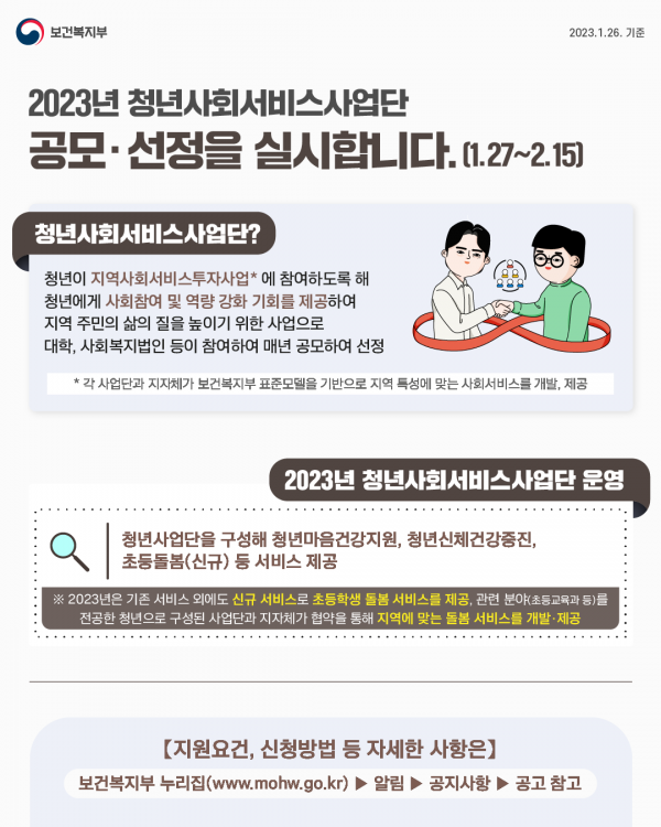 2023년 청년사업단 공모는 1월 27일부터 2월 15일 약 3주간 전국 17개 시·도를 대상으로 실시되며 지자체와 보건복지부 심사를 거쳐 총 30개의 사업단을 선정할 계획이라고 전했다.
